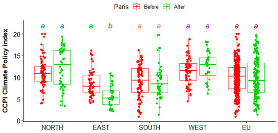 Climate policies have not improved since the Paris Agreement at the EU level or macro-regional level. Different letters (i.e.,—“a” and “b”) depict significant differences between groups, while the same letters (i.e.,—“a” and “a”) show no significant differences.
