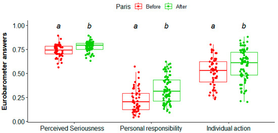 Figure 3 shows public attitudes about climate change at the EU level before and after the Paris Agreement. Different letters (i.e., “a” and “b”) depict significant differences between groups, while the same letters (i.e., “a” and “a”) show no significant differences.