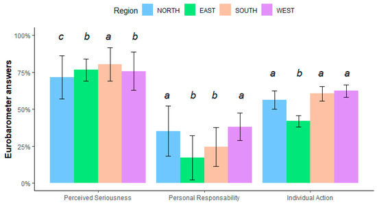 Figure 4 shows public attitudes about climate change at the macro-regional level. Different letters (i.e., “a” and “b”) depict significant differences between groups, while the same letters (i.e., “a” and “a”) show no significant differences between groups.