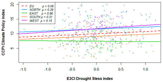 Combining domains now, we looked at possible relationships between climate impacts and climate policies both at the EU and macro-regional levels. At both the EU and macro-regional levels, the relationship between drought stress and climate policy is not significant (Figure 5).