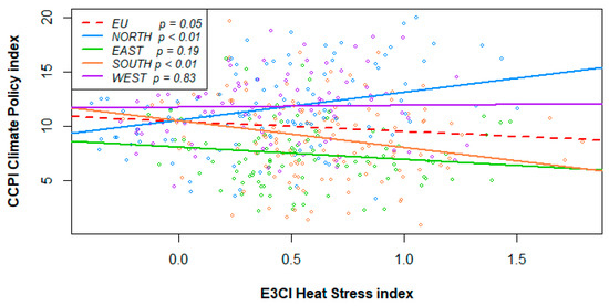 The same analysis was repeated to evaluate the relationship between heat stress and climate policy at the EU and macro-regional levels. At the EU level, the relationship between heat stress and climate policy is significant and negative (p = 0.05, F = 3.86, df = 430). In contrast, at the macro-regional level, the relationship is significant and positive for northern countries (p < 0.01, F = 9.85, df = 110) and significant and negative for southern countries (p < 0.01, F = 7.96, df = 126). Climate policies in western and eastern countries do not appear to be significantly correlated to heat stress (Figure 6).