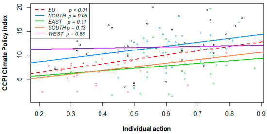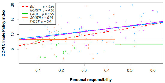 According to our results, the perceived seriousness of climate change and climate policy are not significantly related to one another, both at the EU and macro-regional levels (Figure S3). In contrast, in terms of perceived personal responsibility for tackling climate change, at the EU level, the relationship with climate policy is positive and significant (p < 0.01, F = 29.30, df = 132). At the macro-regional level, only the western countries (p = 0.01, F = 6.82, df = 28) show a significant positive relationship between personal responsibility for climate change and climate policy. In the other regions, there is no significant relationship between these variables. In terms of individual action to fight climate change, at the EU level, there is a positive and significant relationship with climate policy (p < 0.01, F = 18.15, df = 132). At the macro-regional level, no significant relationship was detected between individual action to fight climate change and climate policy.