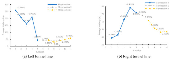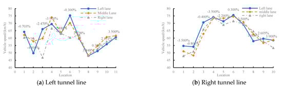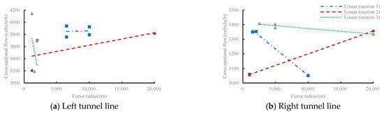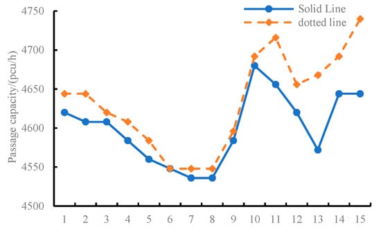 Fifteen cross-sections in the tunnel were selected to count the capacity under different traffic markings, and the statistical results are shown in Figure 18.