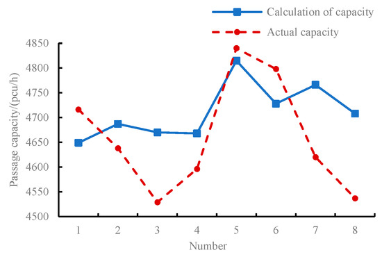 For model validation, the Qingdao Jiaozhou Bay Tunnel’s road conditions following the second marking were chosen. The design of the tunnel markings after the second alignment, the traffic flow parameters, and the parameters corresponding to the tunnel slope, curve radius, and traffic markings were then added to the actual capacity calculation model of the subsea tunnel built in this paper, the calculated values were obtained, and the two were then compared for analysis.