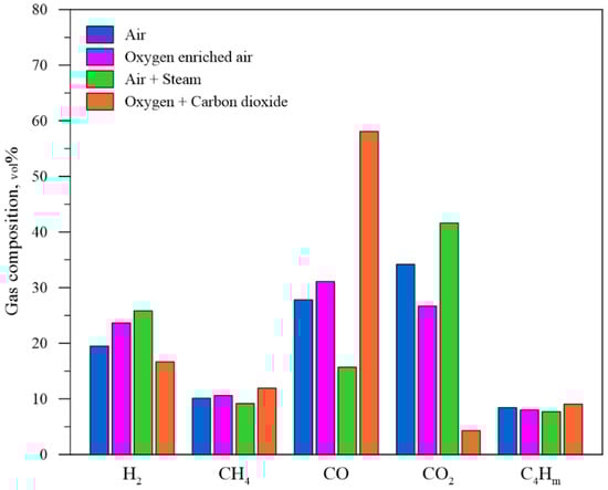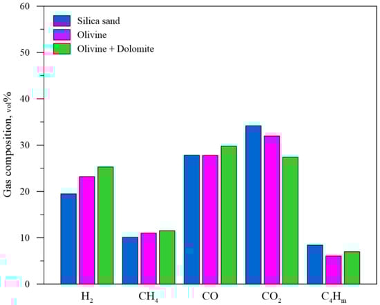 The results showed that the utilization of olivine as bed material produced a significant change in gas composition (Figure 5). It can be observed an increase in H2 (+19.0%) and CH4 (+8.8%) concentrations in the tests with olivine when compared to the use of silica sand. On the other hand, a decrease in CO2 (−6.4%) and C4Hm (−27.9%) was detected. Meanwhile, the concentration of CO remained substantially unchanged.