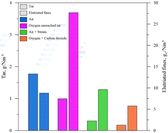 As shown in Figure 4, the utilization of the more reactive gasifying agent enhanced the tar reforming reactions which, in turn, had a favorable effect on the gas quality, increasing GSY (+3.0%), LHV (+16.0%), CCE (+3.9%) and CGE (+19.6%).