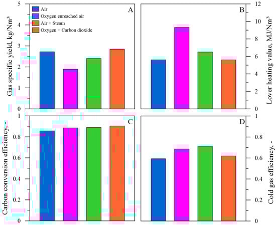 Effect of gasifying agent on specific yield (A), heating value (B), carbon conversion efficiency (C), and cold gas efficiency (D) of gas obtained during the co-gasification tests with a bed of quartz sand.