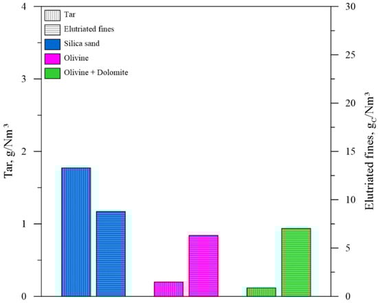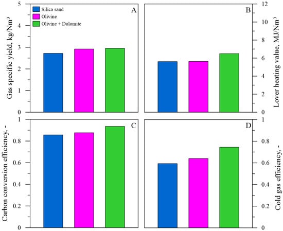 The producer gas obtained during the test with the olivine/dolomite mixture displayed higher concentrations of H2 and CH4 and a lower amount of CO2 than those found in the tests with silica sand and olivine. Instead, C4Hm concentration was about halfway between the values obtained with silica sand and olivine (Figure 5). The great advantage due to the use of olivine/dolomite mixture was shown by the impressive reduction in tar concentration in the producer gas, which decreased about 94% (Figure 6). The positive effect of tar reforming was reflected in the increase in yield and calorific value of producer gas, which rose 8.9% and 15.7%, respectively (Figure 7A,B). Figure 7C,D shows that CCE (+10.0%) and CGE (+26.0%) also improved.