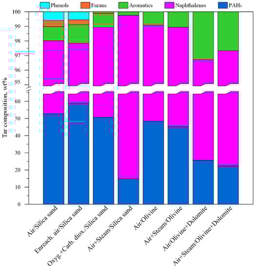 During the tests with silica sand (run 1 vs. runs 3 and 4), the utilization of steam and CO2 reduced PAHs and increased naphthalenes fractions. On the other hand, oxygen-enriched air had an inverse effect, i.e., it increased PAHs and reduced naphthalenes (run 1 vs. run 2).