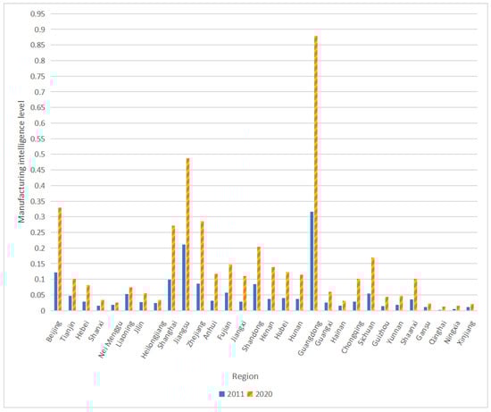 In this paper, the entropy value method was used to assign values to the indicators. To ensure the comparability of data among regions, this paper obtained the weights of each indicator through national data, and then used the weight values to measure the data of 30 provinces, including cities and autonomous regions (the lack of relevant regional data from Tibet was serious and beyond research scope of this paper). The estimated value of the manufacturing intelligence level of each region was obtained from 2011 to 2020. The level of manufacturing intelligence in 2011 and 2020 is shown in Figure 1.