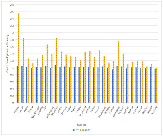 As the super-SBM model provides a static description of green development efficiency, the Malmquist index is needed to dynamically analyze the change in efficiency values over the intervening years. A GML index was constructed based on the global set of production technologies, which allows for effective inter-period comparisons and avoids the linear programming non-solution problem. Therefore, the SBM-GML method was used to measure green development efficiency. We referred to Qiu (2008) [45] to calculate the real value of green development efficiency, assuming that green development efficiency in 2011 was 1; then, green development efficiency in 2012 provides the base period value of the previous year 1 multiplied by the ML index of that year, etc. Green development efficiency in 2012 and 2020 is shown in Figure 2.