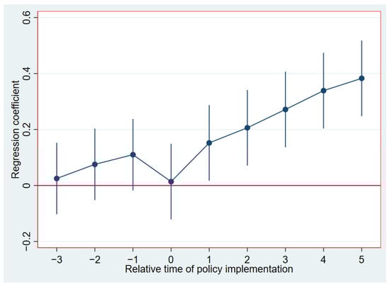 Since the application of the double-difference model must satisfy the premise of the parallel trend assumption, that is, the experimental group and the control group have the same change trend before the implementation of the policy. In order to avoid the effect of multicollinearity, the fourth year before the policy implementation of the “Guidelines for the Construction of National Intelligent Manufacturing Standard System” is estimated as the reference group in this paper, and the test results are shown in Figure 3. Before the policy was implemented, the confidence interval fluctuation range contained 0. After the policy was implemented, the confidence interval fluctuation range was far from 0. It can be seen that before the policy was implemented in 2015, the coefficients of the core explanatory variables were not significant, indicating that there was no significant difference in green development efficiency between the experimental group and the control group, passing the parallel trend test. In addition, the estimated coefficients in the year when the policy was implemented were positive but not significant, and the estimated coefficients were all significantly positive after the policy was implemented, indicating that the policy of the “Guidelines for the Construction of the National Intelligent Manufacturing Standard System” has a lag period of approximately one year regarding the efficiency of green development, and has sustained positive effects.
