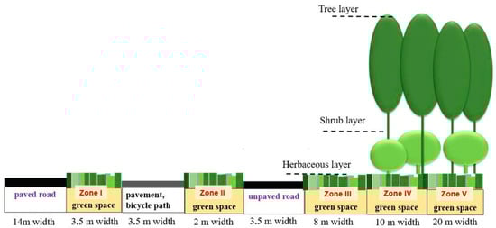 The study site chosen for this research was located in the north-eastern part of Tarnów and comprised green spaces running along a paved road, a bicycle path, and an unpaved road (Figure 1). The paved road (No. 73) is used frequently by city residents, with approximately 5160 cars per 24 h, while the unpaved road is used only occasionally. These green spaces were covered by spontaneous vegetation, which was mowed in areas adjacent to the road. Five green zones (I–V) were chosen as study areas, with each zone further subdivided into four distinct study plots based on the identified plant species. Zones I, II, and III had only a herbaceous layer, while Zones IV and V had herbaceous shrubs and tree layers (Figure 1).