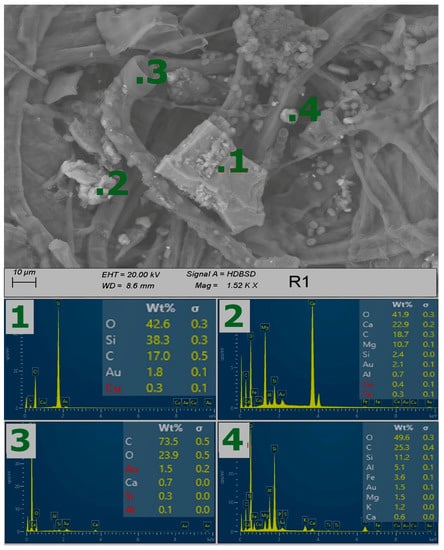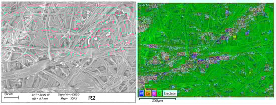 To assess the quantity of inorganic particles in the material under investigation, a semi-quantitative analysis was utilised. An EDX detector and 20 kV EHT (Electron High Tension) were utilised to examine five random regions at 300× magnification for each sample. The total number of silicon, aluminium, and calcium was counted, which served as markers for the inorganic PM content based on a previously developed concept [30]. Figure 2 presents an example of the analysed area using a BSE detector and EDX mapping, which shows the concentration of PM particles and indicates their origin based on the composition of elements.