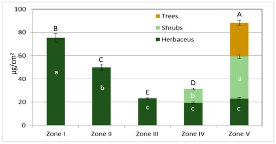 When looking at the different plant types separately, the zone differences were less pronounced. For herbaceous plants, the difference in the accumulation of large PM between Zones I and III, IV, and V was 74%, while for coarse PM, it was 10% less. The same was observed for shrubs, with a difference of 71% for coarse PM and 64% for large PM. Trees accumulated much less of the smaller fraction of PM (58%) than the larger fraction.