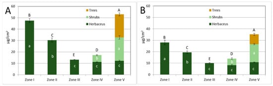 The quantity of SPM accumulated on vegetation due to rain followed the same pattern as total particulate matter, with the greatest accumulation in Zone V and the lowest in Zone III. The same pattern was observed for PM, immobilised in epicuticular wax layers (WPM), although the accumulation was on a smaller scale than SPM. PM on the surface is loosely attached and can be easily removed by external factors, while WPM embedded in wax is more difficult to remove and cannot aggregate into larger particles [3,10,18,19,20,21,22]. The retention of PM by wax decreases towards the end of the growing season when the wax deteriorates [46]. Experimental plants protected from rain by higher plant layers had higher amounts of surface and in-wax PM than those exposed to rainfall. However, the difference was greater for surface PM. The results suggest that the development of leaves is crucial for the phytoremediation of PM, and urban greenery should be organised accordingly [8,9,10,11,18,19,20,21,22,23,24,25,46].