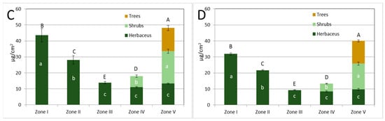 Another type of PM, immobilised in epicuticular wax layers (WPM), was accumulated on a smaller scale than SPM but showed the same pattern (Figure 4D). The amount of WPM on leaves was 23% lower than that of SPM. When comparing different species of herbaceous plants, the amount of SPM and WPM decreased from the road (with a 71% difference between Zones I and II, III, and IV on average), but for shrubs, there was a huge increase between Zones IV and V, amounting to 70% for both types of PM.