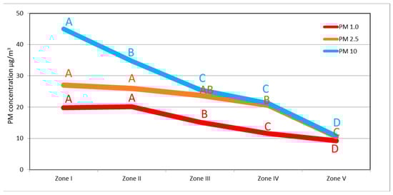The concentration of PM10, PM2.5, and PM1.0 in the air of different zones. Statistically significant differences within the PM fraction are indicated by different letters in each colour.
