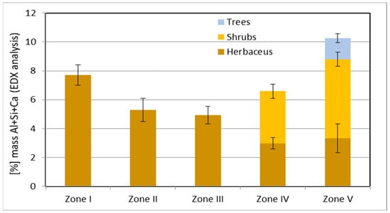 Upon closer examination, it was found that samples collected from the herbaceous plant zones (I–III) located closer to the road contained a higher concentration of inorganic particles. However, in the shrubs and trees zones, the opposite trend was observed, and in order to confirm these observations, a semi-quantitative analysis was conducted.