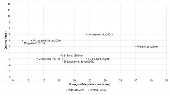 | El-Basyouny and Sayed [69] | TTC | - | conflict survey | 8 h × 2 days | class, right turn | traffic volume | - | 3 years | Total | 1643 | Two-phase model: Lognormal (conflicts)—GLM (NB) (crashes) | 51 signalized intersections |