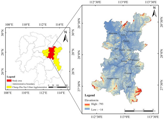 The CZTCA is located in the central-eastern part of the Hunan Province (Figure 1), between 112°03′ E—113°40′ E and 27°06′ N—28°50′ N. It is the key growth area for Hunan Province’s economic development and a significant driver for the rise of central China [28]. The study area is 8629 km2, including the urban areas of Changsha, Zhuzhou, and Xiangtan cities (Yuelu District, Kaifu District, Furong District, Tianxin District, Yuhua District, Wangcheng District, Shifeng District, Hetang District, Tianyuan District, Lusong District, Yuhu District, and Yutang District) as well as Changsha County, Zhuzhou County, and Lukou District, with 15 districts and counties in total. The study area belongs to the typical humid subtropical monsoon climate, with an average annual temperature of about 16~18 °C. The average yearly precipitation in the study area is 1400 mm. The study area is dominated by mountains, hills, and mountainside plains, with good natural conditions.
