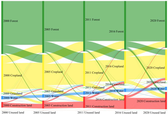 The spatial distribution maps of land use types in the five periods were superimposed and analyzed in ArcGIS10.8, and the land use transfer matrix of each period was constructed. In order to display the analysis results of the land use transfer matrix more intuitively, the Sankey diagram of landscape transfer was constructed with the Origin software to visualize the transfer of each landscape type in the study area, as shown in Figure 3.