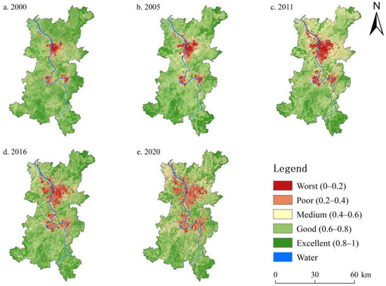 The normalized NDVI, WET, LST, and NDBSI were subjected to principal component analysis by calling the principal component analysis code in the GEE platform, and the results were exhibited in Table 4. As shown in Table 4, the contribution rate of the first principal component (PC1) in 2000, 2005, 2011, 2016, and 2020 were 72.78%, 72.31%, 76.82%, 84.22%, and 87.03%, respectively, with an average of more than 78%, indicating that most of the characteristic information of the four ecological indicators are integrated into PC1. Therefore, it is reasonable to characterize the quality of the regional eco-environment based on the data extracted from the first principal component. The NDVI and WET in PC1 were positive indicators, indicating that they positively affected the eco-environmental quality. The LST and NDBSI were negative indicators that harmed the eco-environmental quality. These results were in line with reality.