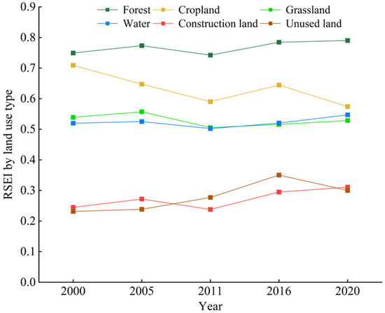 In order to further explore the relationship between land use types and ecological environment, the land use type information and remote sensing ecological index were analyzed and processed to obtain the value of the remote sensing ecological index for each land use type. The result showed differences in the eco-environmental quality under different land use types (Figure 7), which was consistent with the analysis result obtained by Zhu [45]. From 2000 to 2020, the eco-environmental quality of forest and cropland was good, and where forest played an essential role in maintaining a sound ecological environment in the study area. The eco-environmental quality of construction land and unused land was poor.