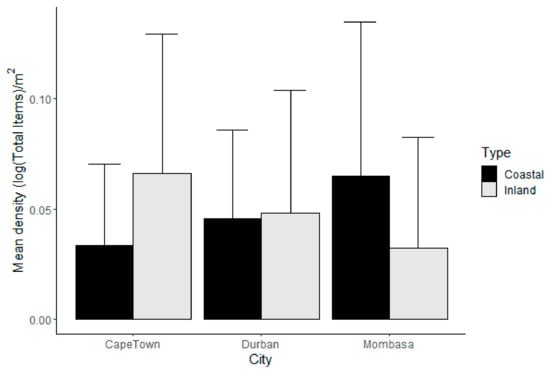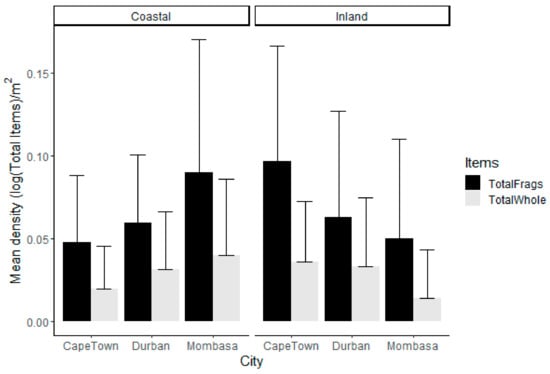 We compared the density of debris on transects in coastal and inland areas of different cities (Figure 2). In Cape Town, the coastal load was approximately one quarter of that for inland areas in the Cape Town surrounds. In Durban, the coastal load was somewhat higher than inland sites surveyed near to Durban, and the Mombasa coastal load was substantially higher than the inland debris load within the Mombasa area (by approximately five times).
