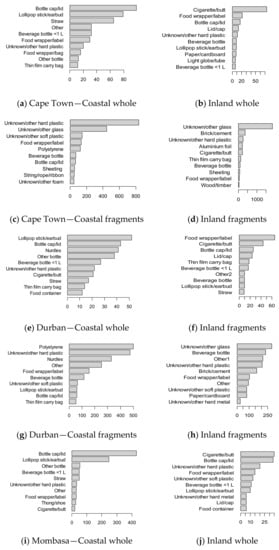 Ten most abundant debris items (counts of whole items and fragments) recorded during coastal and inland transects around Cape Town, Durban or Mombasa. ((a–d) Cape Town; (e–h) Durban; (i–l) Mombasa).