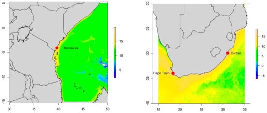 Particles released 200 km offshore collected on the coast near Mombasa in eastern Africa (Figure 6), as well as along the southern coast of South Africa, including around Durban.