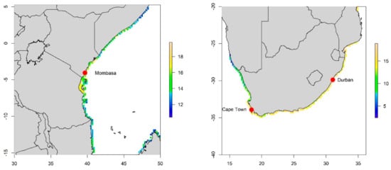 Environmental factors, including oceanic currents and prevailing wind, can also affect debris distribution, particularly in coastal sites []. Prevailing currents and wind can force debris to collect at points on the coast or disperse it. In southern Africa there are two main prevailing currents that could carry or disperse debris. The Agulhas current runs southward along the coast of east Africa, so we expect it might transport debris as it passes major cities such as Mogadishu, Mombasa, Dar es Salaam, Maputo, and Durban []. Conversely, the Benguela current, which runs northward along the western coast of Africa, originates from the Antarctic circumpolar current, and hence is less likely to transport plastic to southern Africa []. Hence, if plastic distributions along the coastline are predominately influenced by oceanic transport, we would expect to see higher levels of debris in Mombasa and Durban, along the east coast, than we would in Cape Town.