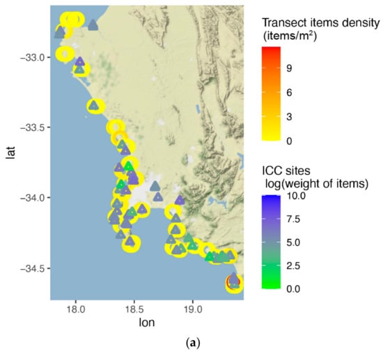 International Coastal Cleanup (ICC) beach clean-up events took place at 160 beach sites in South Africa over the period 2012–2015 (Figure 7). Of these coastal clean ups, 99 were west of Cape Agulhas in south-western South Africa. Only eight were east of East London, and only one took place around Durban (and well away from our transects). Hence there was considerably more citizen-science led cleaning activity in the region of Cape Town. However, we are aware that litter and other anthropogenic debris is frequently collected from beaches in front of hotels in Mombasa [].