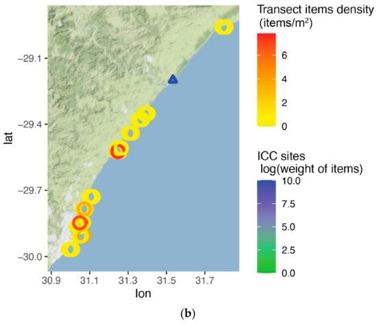 Positions of Coastal Transects for Cape Town (a) and Durban (b). Transect locations are in circles with colour indicating density of debris recorded. Triangles show locations of ICC marine debris clean-up efforts.