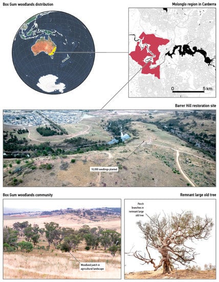 Barrer Hill case study. Top left: The yellow region shows the historical extent of the box-gum-woodland ecological community. Top right: The red region shows new development in the wider Canberra area. Middle: the degraded ecosystem of Barrer Hill. Bottom left: trees in an intact grassy woodland. Bottom right: perch sites provided by a remnant large old tree.