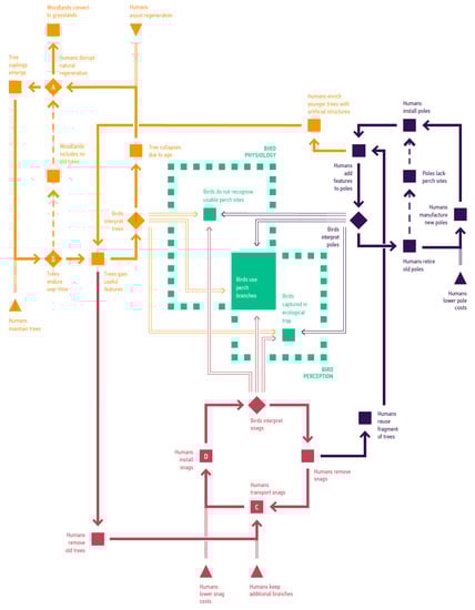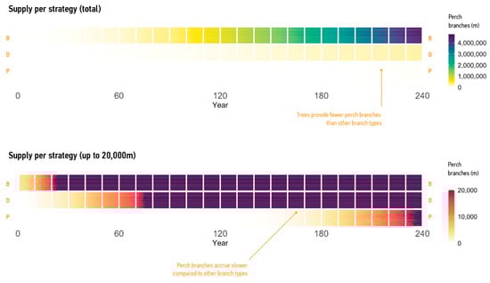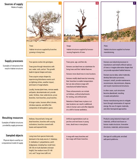 Supply-mode characteristics. We examined the supply of perches in three simplified modes derived from case studies. The ‘Trees’ mode, represented by orange, groups habitat features supplied by branches in trees. The ‘Snags’ mode, indicated by red, includes features in relocated dead trees. Lastly, the ‘Poles’ mode, indicated by purple, includes habitat features provided through human manufacturing.