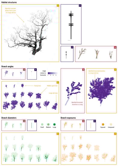In natural ecosystems, characteristics of habitat features underpin many ecosystem interactions [20]. Spatial and temporal patterning stratifies ecosystems into niches [21], influencing populations and communities [22]. Models can help ecologists, planners, and others understand processes that produce habitat features in landscapes with large old trees [6,23]. However, current models often employ coarse-grain resolutions and adhere to general principles such as allometric scaling or consider large groups of trees without sufficiently differentiating between individuals [24]. This level of detail does not capture significant habitat features, including branches, leaves, and bark of large old trees [4,25].