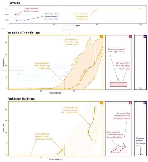 To compare perch behaviours on different structures, we considered habitat features provided by living trees as well as manufactured beams and platforms [60]. Enriched utility poles with elevated perches and nesting platforms as well as snags have increased local bird abundance and species richness [11]. The structures provide examples of habitat features for numerical modelling.