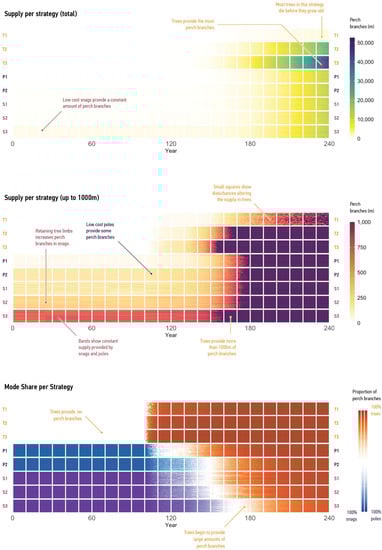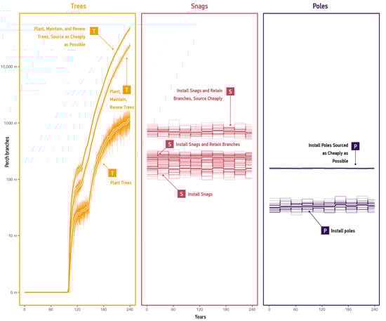 The model uses six processes to cover a representative period of supply (Table 3). Eucalyptus trees in the region become large enough to supply habitat features after approximately 175 years [11]. We selected 240 years as a representative period that we observed to be sufficient for the model to establish distinct trends.