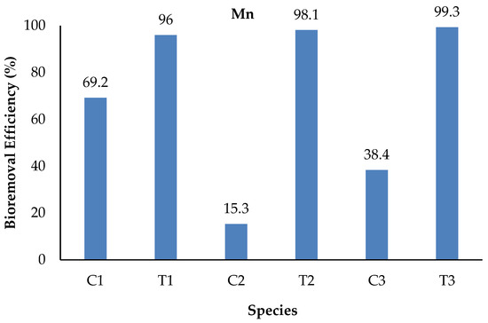 Mn concentrations checked at the initial stage for both control and treated water were 0.013 and 1.23 mg/L, respectively. At the final stages, the Mn mean concentration ranged from 0.004 to 0.011 mg/L for the control and from 0.008 to 0.049 mg/L for the treated water samples, as shown in Table 2. The highest values were recorded in T1 for the treatment water, while in C2 for the control water samples at the final stage. The study found a 69.2, 96, 15.3, 99.1, 38.4, and 99.3% reduction in the final water samples of C1, T1, C2, T2, C3, and T3, respectively. The highest bioremoval efficiency (R) was shown by T3, whereas the lowest was for C2 (Figure 1). Ali et al. [35], investigated the physicochemical parameters of the water collected from the Kurram River, Pakistan, and found much higher values (4–10 mg/L).