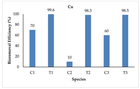 The Co levels checked at the initial stage for both control and treatment water, were 0.014 and 0.151 mg/L, respectively. At the final stages, the mean values ranged from 0.009 to 0.012 mg/L for the control and from 0.081 to 0.102 mg/L for the treated water samples. The highest values were recorded in T1 for the treatment water, while in C1 for the control water samples. The study found 14.2, 32.4, 21.4, 46.3, 35.7, and 41% reductions in the final water samples of C1, T1, C2, T2, C3, and T3, respectively. The highest bioremoval efficiency was observed in T2, whereas the lowest was in C1 (Figure 5). Similarly, Gokalp and Mohammed [36] carried out a research study on the assessment of metal pollution in Heshkaro, Iraq, and determined lower concentrations (0.00002–0.00233 mg/L) of Co. The differences may be ascribed to the difference in the water sample collection site and the initial metal concentration.