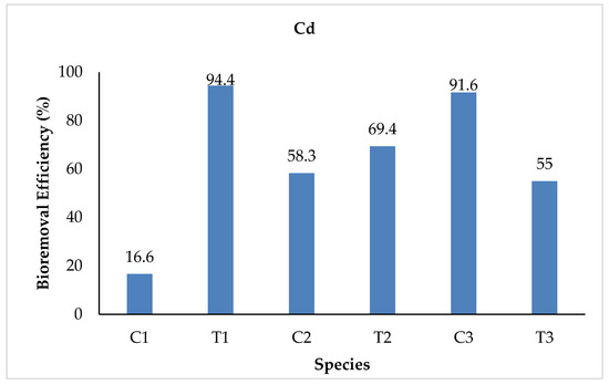 The Cd concentrations determined at the initial stage for both the control and treated water samples were 0.012 and 0.18 mg/L, respectively. At the final stages, the mean values ranged from 0.001 to 0.010 mg/L for the control and from 0.010 to 0.081 mg/L for the treated water samples. The highest values were recorded in T3 for the treatment water, while in C1 for the control water samples. The study found reductions of 16.6, 94.4, 58.3, 69.4, 91.6, and 55% in the final water samples of C1, T1, C2, T2, C3, and T3, respectively. The highest bioremoval efficiency was observed in T1, whereas the lowest was in C1 (Figure 4). Ali et al. [35] conducted a study on the physicochemical parameters of water collected from the Kurram River, Pakistan, and found a very similar cadmium concentration (0.14 mg/L). Another study conducted on the industrial WW at the Hayatabad Industrial Estate by Ayaz et al. [3], observed a much higher Cd concentration (4.5–8.0 mg/L).