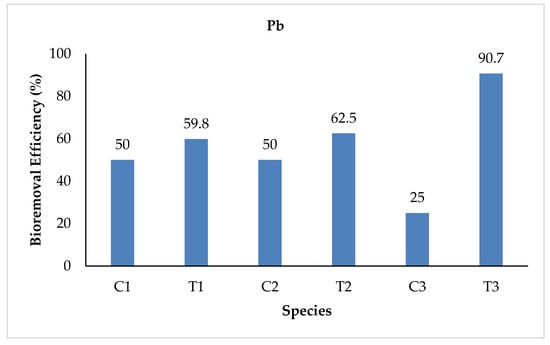 The Pb concentrations checked at the initial stage for both control and treated water were 0.002 and 1.12 mg/L, respectively. At the final stages, the mean values ranged from 0.001 to 0.0017 mg/L for the control and from 0.104 to 0.450 mg/L for the treated water samples. The highest values were recorded in T1 for the treatment water, while in C3 for the control water samples. The study found 50, 59.8, 50, 62.5, 25, and 90.7% reductions in the final water samples of C1, T1, C2, T2, C3, and T3, respectively. The highest bioremoval efficiency was observed in T3, whereas the lowest was in C3 (Figure 7). The initial Pb concentration observed for industrial WW was 1.12 mg/L. In another study, conducted on the industrial WW at the Hayatabad Industrial Estate, by Ayaz et al. [3], a much higher Pb concentration (6.81–8.01 mg/L) was observed. The difference in results may be due to the initial concentration difference. In the initial stage the Ni concentration observed in the industrial WW was 0.026 mg/L. Ali et al. [35] analyzed the physicochemical parameters of the water collected from the Kurram River, Pakistan, and found a much higher Ni concentration (2.0–10.5 mg/L). These results differences can be ascribed to the difference in the study area and initial concentrations of Ni.