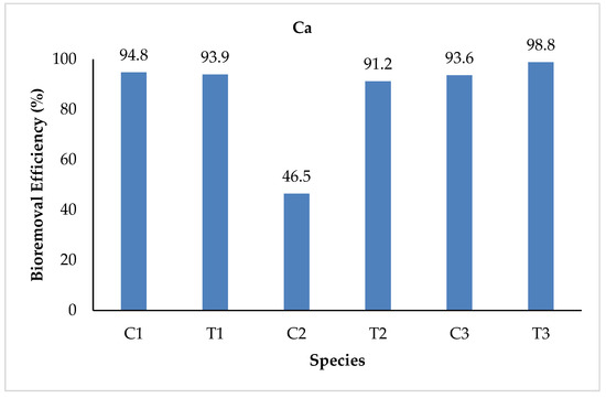 The Ca levels checked at the initial stage for both the control and treated water were 1.72 and 14.5 mg/L, respectively. At the final stages, the mean values ranged from 0.088 to 0.920 for the control and from 0.880 to 1.265 mg/L for the treated water samples. The highest values were recorded in T2 for the treatment water, while in C2 for the control water samples. The study found 94.8, 93.9, 46.5, 91.2, 93.6, and 98.8% reductions in the final water samples of C1, T1, C2, T2, C3, and T3, respectively. The highest bioremoval efficiency was observed in T3, whereas the lowest was in C2 (Figure 9). The findings are not in agreement with the findings (376.9–468 mg/L) of the study by Fito et al., which reported on the physicochemical properties of the sugar industry WW [24].