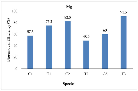 The Mg levels checked at the initial stage for both the control and treated water were 0.040 and 0.19 mg/L, respectively. At the final stages, the mean values ranged from 0.007 to 0.017 mg/L for the control and from 0.016 to 0.97 mg/L for the treated water samples. The highest values were recorded in T2 for the treatment water, while in C1 for the control water samples. The study found 57.5, 75.2, 82.5, 48.9, 60, and 91.5% reductions in the final water samples of C1, T1, C2, T2, C3, and T3, respectively. The highest bioremoval efficiency was observed in T3, whereas the lowest was in T2 (Figure 10). However, in another study conducted by Nirgude et al. [38] on the physicochemical evaluation of industrial effluents from Indian industrial areas, much higher values (34 to 3246 mg/L) were observed. The recent finding is not in agreement with the results (274.2–341.0 mg/L) of the study by Fito et al., which reported on the physicochemical properties of the sugar industry WW [24]. The difference may be ascribed to the difference in the initial concentration, water sample collection site, and season of collection.