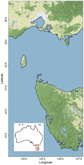 The leaf collection encompassed the entire natural latitudinal range of Nothofagus cunninghamii (collection sites are shown in Figure 1). The field collection design is shown in Figure 2. The Victorian specimens were collected using permit number 10007653 from Parks Victoria and the Tasmanian specimens were collected under permit number FL17019 from the Department of Primary Industries, Parks, Water and Environment.