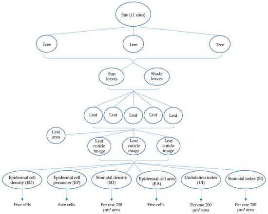 where UI is the undulation index, Ce is the cell circumference (µm), Co is the circumference of a circle with the same area as the cell, Ae is the cell area. The undulation index is defined by Kürschner, 1997 [19], as the ratio of the measured epidermal cell circumference to the circumference of a circle with the same area as the cell. Essentially, the higher the undulation index, the more sinuous the cell walls, the lower the undulation index, and the straighter the cell walls. The undulation index varies with the degree of cell wall undulation but not the cell area [20].