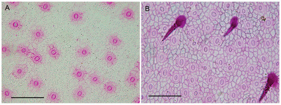 where SI is the stomatal index, SD is the stomatal density (stomata mm−2) and ED is the epidermal cell density (epidermal cells mm−2). The stomatal index is the proportion of epidermal cells that have transformed into stomata. It is independent of the epidermal cell size [21].