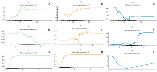 Accumulated local effects plots depicting the effects of (A) minimum spring temperature (°C), (B) maximum spring temperature (°C) and (C) total summer rainfall (mm) on (A–C) leaf area (mm2); (D) minimum spring temperature (°C), (E) maximum spring temperature (°C) and (F) total summer rainfall (mm) on (D–F) stomatal index (%); and (G) minimum spring temperature (°C), (H) maximum spring temperature (°C) and (I) total summer rainfall (mm) on (G–I) undulation index. The x-axis is the leaf measurement. The y-axis describes how likely a leaf is to be sun or shade; if the plot is above zero on the y-axis, then the leaf is from a shade position, and if the line is below zero, then the leaf is from a sun position. For example, in A, leaves with a leaf area less than 100 mm2 are sun leaves and those with a leaf area more than 100 mm2 are shade leaves.