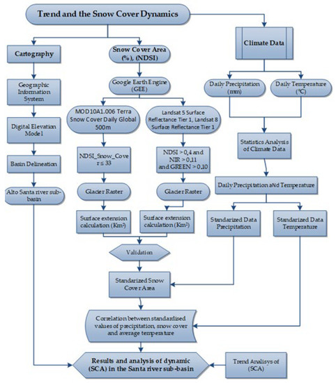 Some methodologies and techniques are applied to determine the monitoring of the dynamics of snow cover area and glaciers in the tropical Andes, to understand the relationships with climatological variables in these and other regions of the world [12,13]. For this case and other studies, the MODIS product was launched on 18 December 1999, and the Terra satellite was established, including the moderate-resolution imaging spectroradiometer (MODIS). Most of these geophysical products were obtained from MODIS data, including snow cover area products around the globe. These products have been available at the National Snow and Ice Data Center (NSIDC) since 13 September 2000 [14]. Many snow cover maps have been obtained in the last two decades using MODIS products. This information is essential because it has a very high temporal resolution of (1 day) and a spatial resolution of (500 m) [15,16]. Therefore, taking advantage of the high temporal resolution of the MODIS images, it is necessary to know the snow cover area (SCA) of the Cordillera Blanca on a daily scale to know its dynamics of change and its relationship with the main climatic forcing, which is different from previous studies that consider mainly an evaluation of the dynamics of snow cover loss at annual time steps. The layers of the MODIS product’s snow cover area (SCA) have several advantages that make them well-suited for use at the hemispheric scale. One of the key advantages is the availability of information, which has improved over time due to the effective spatial resolution of the product [14]. The snow cover area acquisition, time series of MODIS, and Landsat 5 Surface Reflectance Tier 1 and Landsat 8 Surface Reflectance Tier 1 images were used, from 2000 to 2017, these images were processed and classified in the cloud platform Google Earth Engine [5]. The Google Earth Engine platform was designed to perform geospatial analysis of data from different sensors on a planetary scale, based on the massive computing capabilities of Google itself, in order to analyze various environmental, social, and economic problems, such as natural disasters, deforestation, diseases, food security, climate change, water management, among others [17].